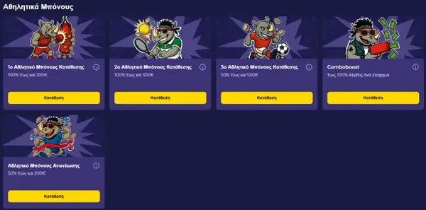 • Μπόνους καλωσορίσματος για αθλητικά στοιχήματα: μπόνους 250% έως €1,000 κατανεμημένο στις πρώτες τρεις καταθέσεις