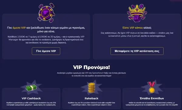 Το πρόγραμμα επιβράβευσης μας χρησιμοποιεί ένα σύστημα πέντε επιπέδων με ανταμοιβές ανόδου επιπέδου, καθώς και ένα ξεχωριστό VIP πρόγραμμα για παίκτες που θέλουν πιο προσωπική υποστήριξη. Όσο ανεβαίνετε επίπεδα, μπορείτε να ξεκλειδώσετε μεγαλύτερη αξία μέσω cashback και ανταμοιβών τύπου rakeback, ενώ μπορεί να λαμβάνετε προσφορές ανάλογα με το πώς παίζετε. Spinorhino διατηρεί αυτό το πρόγραμμα μέσα στον λογαριασμό σας, ώστε να παρακολουθείτε πού βρίσκεστε και τι ακολουθεί.
