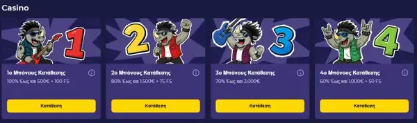 Το πακέτο καλωσορίσματος είναι μια σειρά πέντε καταθέσεων με το ίδιο απλό σημείο εκκίνησης: ελάχιστη κατάθεση €20 και απαίτηση τζίρου 40x. Η πρώτη κατάθεση δίνει τον μεγαλύτερο συνδυασμό επιπλέον χρημάτων και δωρεάν περιστροφών, ενώ οι επόμενες καταθέσεις επικεντρώνονται σε υψηλότερα μέγιστα ποσά ώστε να ανεβάσετε ρυθμό αν το επιλέξετε. Μπορείτε να διεκδικήσετε κάθε βήμα όταν είστε έτοιμοι, αρκεί η προσφορά να παραμένει ενεργή στον λογαριασμό σας.