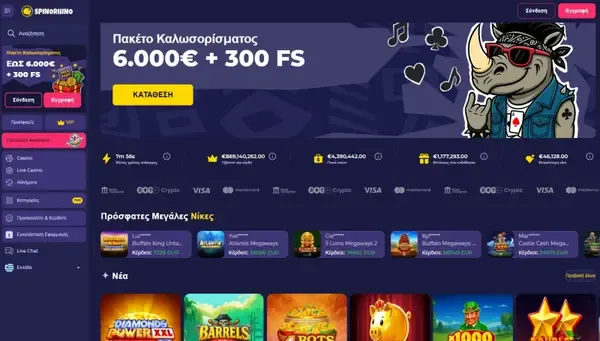 Καλώς ήρθατε στο Spinorhino Casino, σχεδιασμένο για Έλληνες παίκτες που θέλουν μεγάλη ποικιλία παιχνιδιών και ξεκάθαρους κανόνες λογαριασμού. Ξεκινήσαμε το 2026 υπό την Blackhall Technology Group Limitada, με έμφαση στη γρήγορη απόδοση του site και στις λεπτομερείς πληροφορίες παιχνιδιών. Αν συγκρίνετε επιλογές για καζίνο Spinorhino Ελλάδα, θα βρείτε 8.500 παιχνίδια, στοίχημα αθλημάτων και απλές τραπεζικές επιλογές σε EUR.