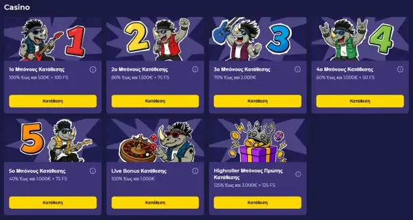 Χρησιμοποιούμε ένα πλάνο προσφορών με βάση την κατάθεση, ώστε οι Έλληνες παίκτες να ταιριάζουν τον προϋπολογισμό τους και να επιλέγουν πότε θα διεκδικήσουν τις προσφορές. Θα δείτε τους βασικούς όρους του μπόνους να εμφανίζονται σε κάθε promo, συμπεριλαμβανομένης της ελάχιστης κατάθεσης και των κανόνων τζίρου.