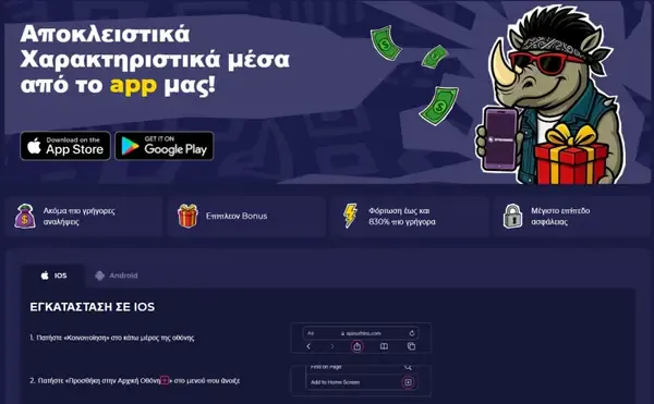 Το παιχνίδι από κινητό είναι διαθέσιμο μέσω του browser, ώστε να ανοίγετε παιχνίδια και να διαχειρίζεστε τον λογαριασμό σας χωρίς downloads. Δεν υπάρχει εγγενής εφαρμογή Spinorhino για iOS ή Android αυτή τη στιγμή και δεν σας ζητάμε να εγκαταστήσετε αρχεία τρίτων. Αντ’ αυτού, μπορείτε να χρησιμοποιήσετε Safari, Chrome ή άλλον σύγχρονο browser στο κινητό ή το tablet σας.