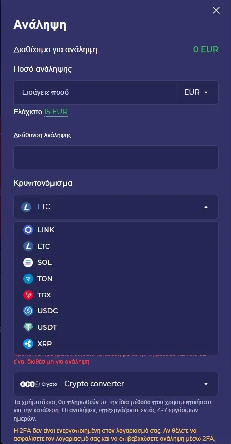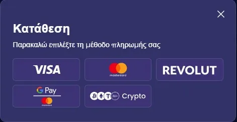 Υποστηρίζουμε καταθέσεις και αναλήψεις σε EUR στην Ελλάδα με επιλογές καρτών, τραπεζικά εμβάσματα για αναλήψεις και ευρεία λίστα crypto για γρήγορη χρηματοδότηση. Οι καταθέσεις ξεκινούν από €20 σε υποστηριζόμενες μεθόδους. Οι αναλήψεις εξαρτώνται από τη μέθοδο: οι κάρτες και τα τραπεζικά εμβάσματα αναφέρονται ως 4–7 εργάσιμες ημέρες, ενώ τα crypto αναφέρονται ως έως 2 εργάσιμες ημέρες.
