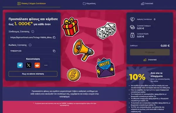Αν αναζητάτε συγκεκριμένα μπόνους χωρίς κατάθεση καζίνο Spinorhino, σημειώστε ότι εστιάζουμε αντ’ αυτού σε προωθητικές ενέργειες με κατάθεση. Προτείνουμε να ελέγχετε τη σελίδα προσφορών για τις πιο πρόσφατες ενεργές επιλογές και τους ακριβείς όρους για κάθε τύπο μπόνους.