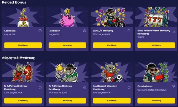 Μετά το πακέτο καλωσορίσματος, κρατάμε τις προσφορές ενεργές με απλές μορφές και ορατούς όρους. Η προσφορά Daily Cashback μπορεί να επιστρέψει έως 15% κάθε μέρα για να βοηθήσει στη μείωση των απωλειών, βάσει των κανόνων που εμφανίζονται στις λεπτομέρειες της προσφοράς. Για τους φίλους του sportsbook, τρέχουμε περιοδικά Sport Reload Bonus που προσθέτει επιπλέον αξία σε επιλεγμένες περιόδους reload για αθλήματα.