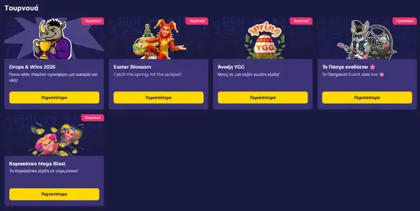 Οι παίκτες τουρνουά μπορούν να συμμετέχουν στο Daily Drops & Wins, όπου τίτλοι της Pragmatic Play συνδέονται με ημερήσια prize pools. Τρέχουμε επίσης το Weekend Madness Tournament, με κορυφαία έπαθλα που περιλαμβάνουν €1,000 για την 1η θέση, βάσει των αποτελεσμάτων του leaderboard. Αυτά τα events λειτουργούν καλά αν σας αρέσουν στόχοι που δεν συνδέονται με μία μόνο διεκδίκηση μπόνους.