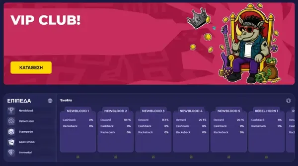 Το VIP πρόγραμμα μας είναι σχεδιασμένο για παίκτες που θέλουν περισσότερη ευελιξία σε τραπεζικές συναλλαγές και εξυπηρέτηση. Τα VIP μέλη μπορούν να λάβουν υψηλότερα όρια ανάληψης και αποκλειστική υποστήριξη. Αν είστε ήδη ενεργοί στο Spinorhino Casino, μπορείτε να ρωτήσετε στο live chat τι απαιτείται για να ανεβείτε επίπεδα και ποια προνόμια ισχύουν σε κάθε στάδιο.